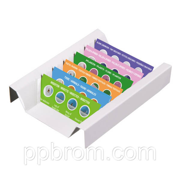 Детский набор специально подготовленных образцов (слайдов) для исследования под микроскопом, помещенных в красочную подарочную упаковку. Набор состоит из шести блоков слайдов, каждый из которых включает по четыре образца, объединенных одной тематикой. Образцы подобраны таким образом, чтоб наблюдения было интересно проводить как бод биологическим, так и под стереоскопическим микроскопом. Слайды преимущественно представляют собой образцы живой природы, окружающей нас в повседневной жизни, и позволяют взглянуть на окружающий мир в деталях.
